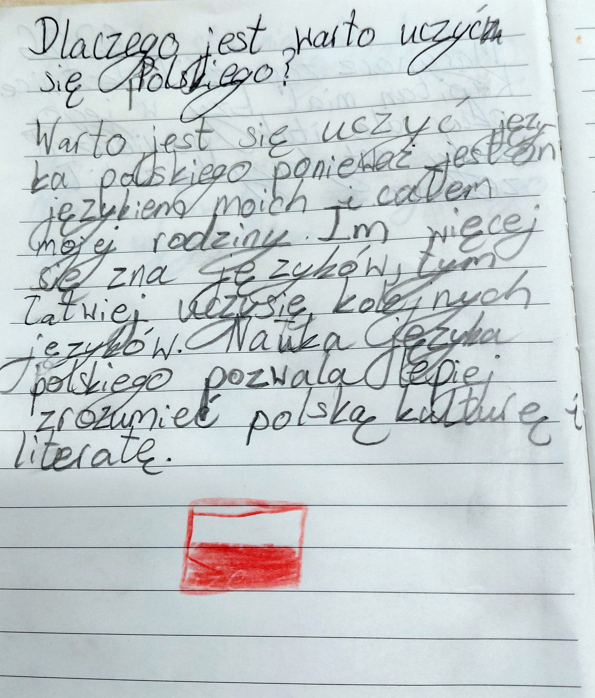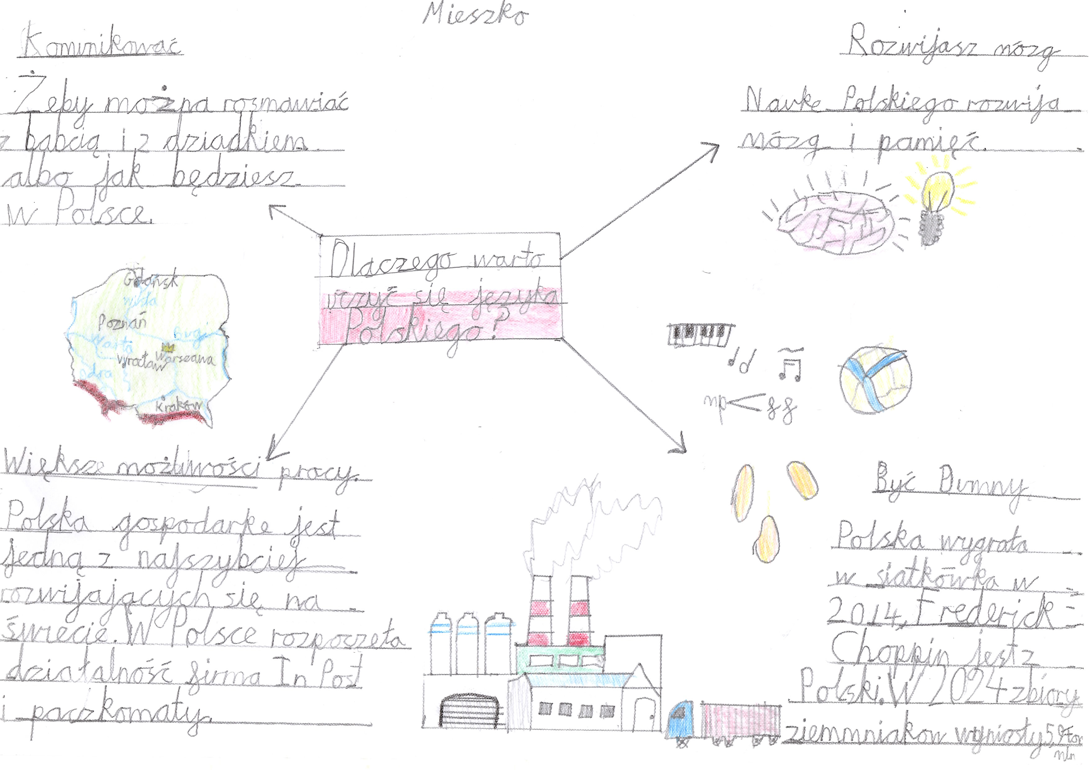 Polska jest dla mnie fajna, bo lubię polską kuchnię, i moja babcia tam mieszka. Polska jest fajna, bo lubię widoki, a w Polsce jest ich bardzo dużo. Polska jest fajna, bo ja lubię góry i Mazury, i duże rzeki.
