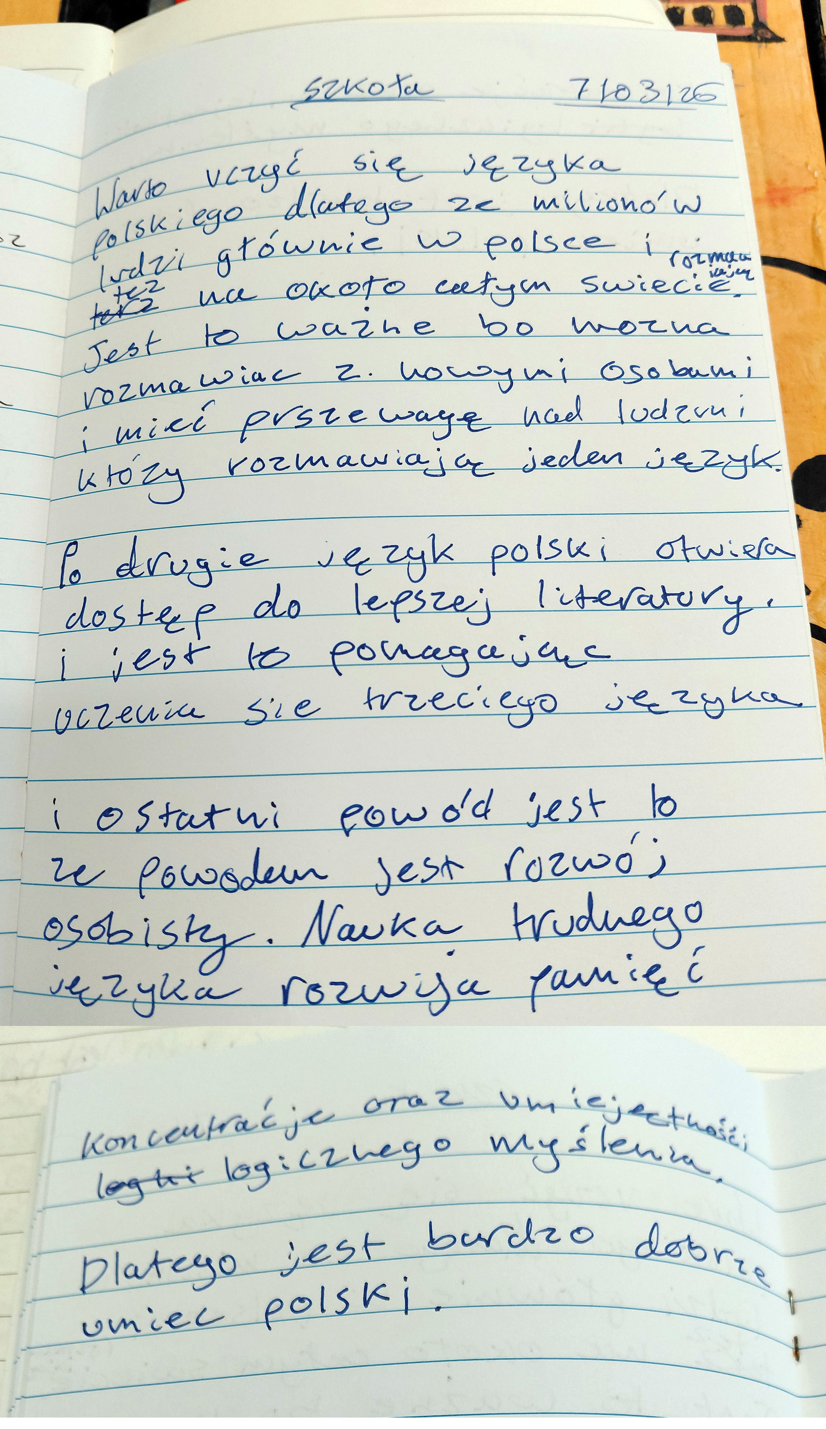 Ja kocham Polskę, dlatego że tam mam rodzinę. Kocham Polskę, bo ma piękne widoki i piękne miejsca. Lubię Polskę, bo ma wspaniałe krajobrazy. Kocham Polskę, dlatego że jest tam bardzo dużo atrakcji. Lubię Polskę, bo tam są góry i Energylandia. Kocham Polskę, bo smakuje mi polska kuchnia. Lubię Polskę, bo mam tam koleżanki i kolegów. Kocham Polskę, bo tam są szczerzy ludzie. Lubię Polskę, bo są tam rzadkie zwierzęta.