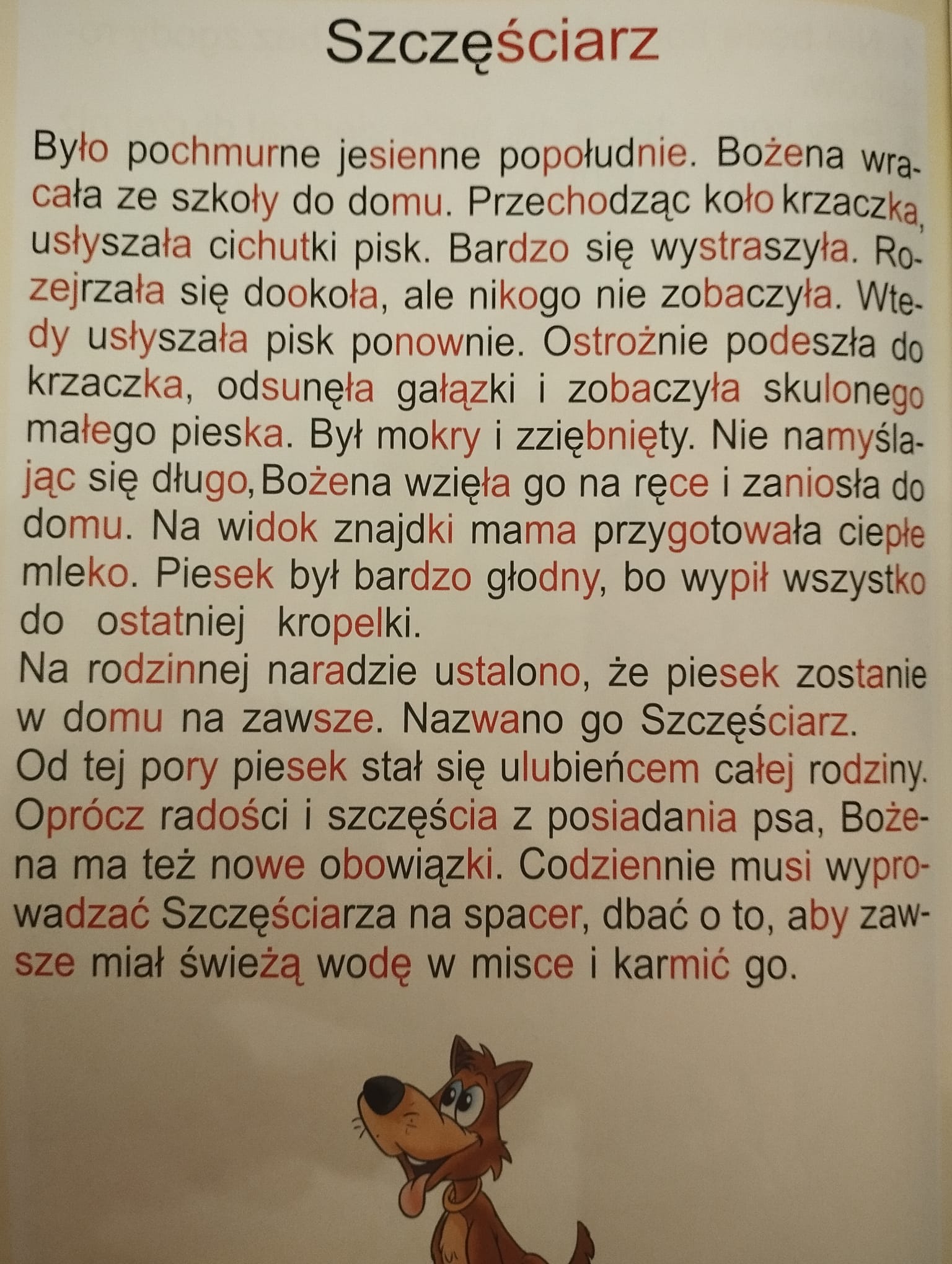 Na ostatnich zajęciach robiliśmy ćwiczenia ortograficzne. W przyszłą sobotę sprawdzimy się pisząc dyktando (słówka ze str.33 i 34). Dla grupy szlifującej czytanie tekst „Hejnał”. Dla wszystkich jako zadanie domowe rozdział z „Pamiętnika grzecznego psa” (w załączniku) i proszę pisemnie odpowiedzieć na pytania do tekstu.